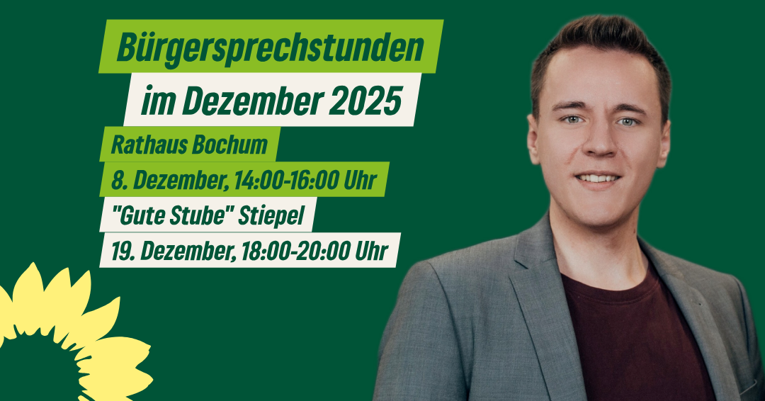 Beginnend ab Dezember werde ich als Mitglied des Bochumer Stadtrates zweimal im Monat eine offene Bürgersprechstunde👥 anbieten – jeweils einmal in Stiepel (in den Räumlichkeiten der Guten Stube, Kemnader Straße 309) und einmal im Bochumer Rathaus (Raum 068).